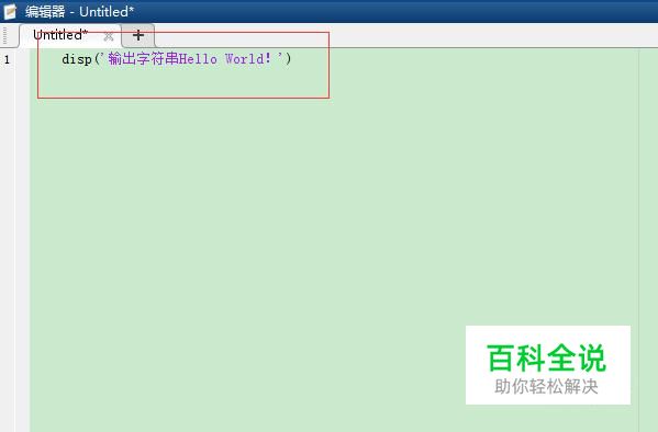 在新建的脚本文件中输入disp('输出字符串Hello World!'),如图。