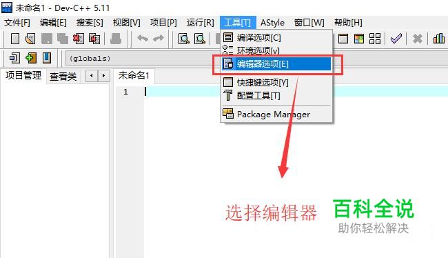 首先打开Dev C++编辑器,点击顶部的工具菜单,然后选择编辑器选项,如下图所示