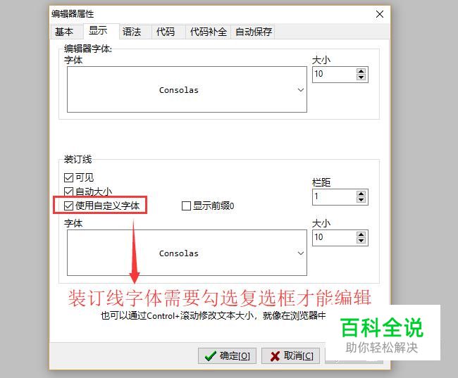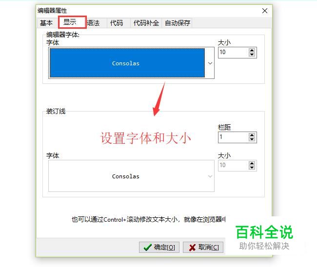 接下来在弹出的编辑器属性界面中,切换到显示页卡,如下图所示,在编辑器字体中可以修改字体的类型和大小
