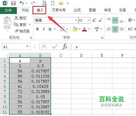 使用excel将我们的表格文件打开,然后在菜单那里找到插入选项,如图所示: