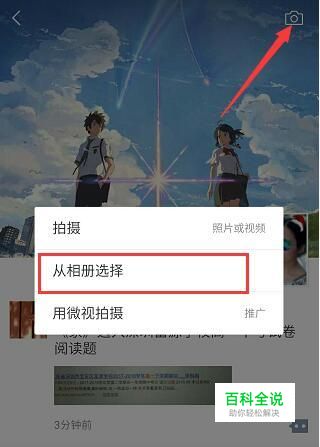 首先要把视频录制好,放在手机相册里,进入微信朋友后,点击右上角的“相机”,再点击“从相册中选择”