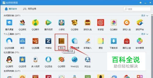 如果你想把通讯录这个图标放到QQ软件界面上的,你可以点击应用管理器里面的通讯录上面的“添加”,就可以把这个图标弄到QQ软件界面上了 如图