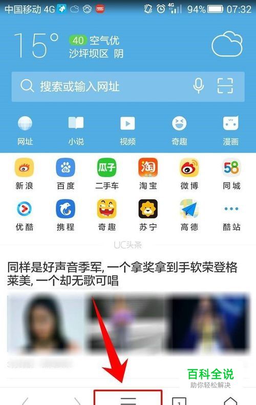 找到隐藏窗口 进入UC浏览器的主页,在页面中找到三条横线的图标,点击这个图标,展开UC浏览器的隐藏窗口,如图所示。