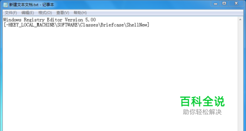 打开此文档,在文档中添加下列文字: Windows Registry Editor Version 5.00 [-HKEY_LOCAL_MACHINE\SOFTWARE\Classes\Briefcase\ShellNew]