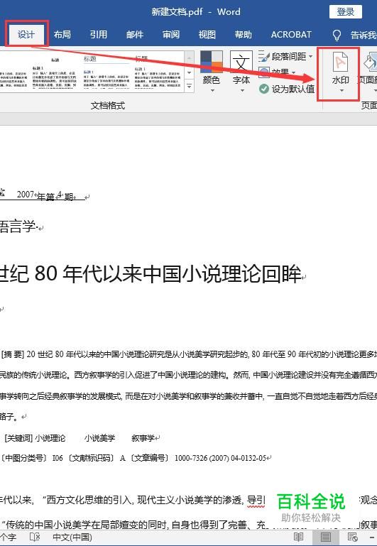 用Word软件将PDF文件转换并打开后,和给word文件添加水印的操作相同,点击设计按钮,再选择水印按钮点开。
