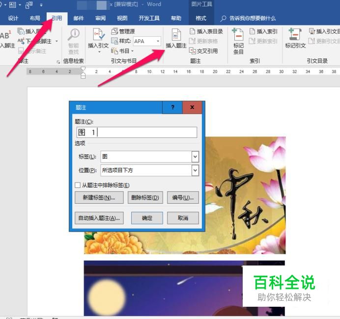 图片的名称就在题注框里设置,将光标定位在题注框,直接输入图片名称,如“嫦娥奔月”,点击【确定】。第一张图片设置完成。