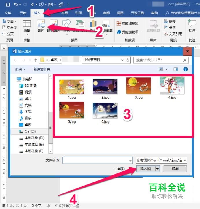 打开word文档后直接插入所有图片,如果按照一般的方法就是一张一张插入,再编号,但那样实在太烦琐了。【插入】---【图片】---选择文件夹---Ctrl+A选择所有要插入的图片,点击【插入】即可