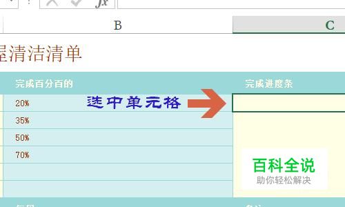 假如我们想要在下面图标的进度条这一列插入对应的进度条,那么首先选中其中某个单元格,如图...