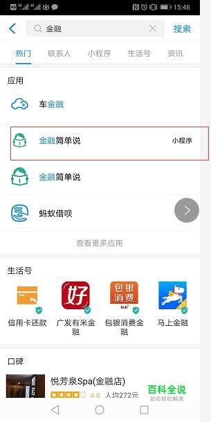 下载支付宝APP,登陆会员,在搜索框搜索金融简单说
