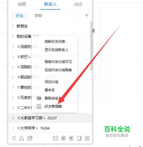 进入之后,在联系人页面右击一下选择“好友管理器”,如图所示。