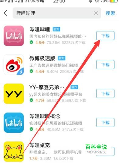 进入之后,搜索“哔哩哔哩”,将其下载并安装到手机上面,如图所示。