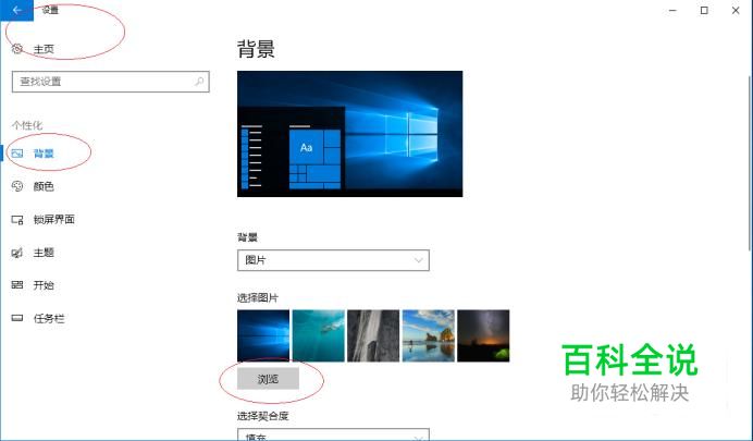 唤出"设置"程序窗口,点击"背景→选择图片→浏览"按钮。