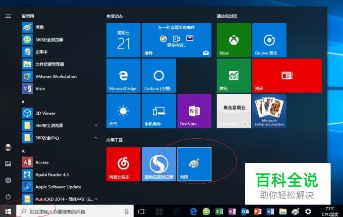 点击任务栏"开始"按钮,选择"画图"磁贴。