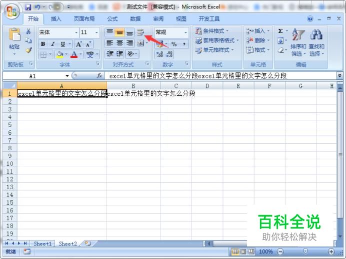 我们将光标定位到需要分段的单元格,再点击菜单栏自动换行标志即可