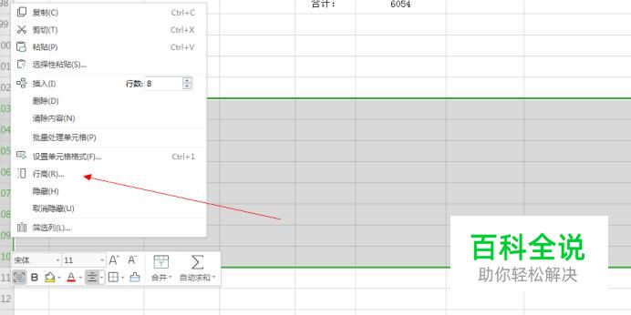 鼠标右键选择之后会跳出一个菜单,选择“行高”,我已经用红色箭头标识好。