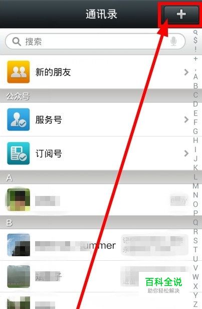 首先,我们打开微信,来到 通讯录的界面,在界面的右上角有个 加号(+),点击进入。