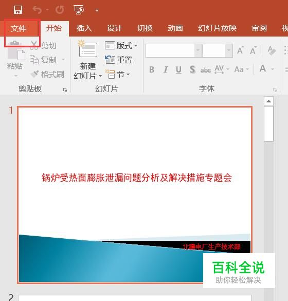 首先,使用Office软件打开幻灯片PPT文件,点击页面中的“文件”菜单选项。