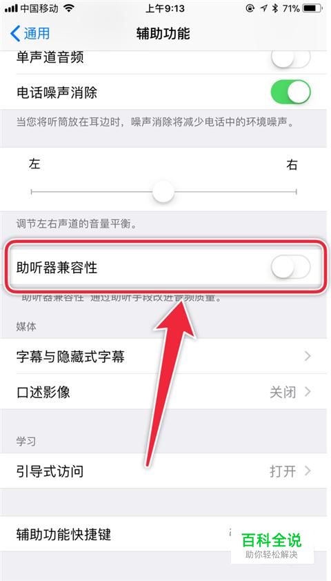 接着点击开启助听器兼容器开关,如下图所示。