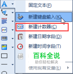 1、在NiceLabel左侧工具栏中,单击文本创建图标后的下拉箭头,单击选择“新建计数器”。