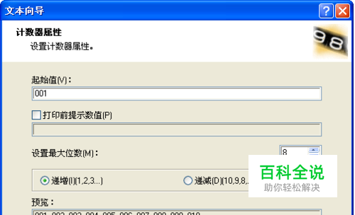 2、在弹出的文本向导中,首先设置计数器的起始值,规定计数器变化规律(递增或递减)。单击下一步。