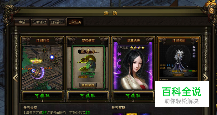 面对传闻,有些人置若惘然,有些人则打破沙锅问到底。在9377《笑傲群侠》的纷乱江湖里,江湖小虾、江湖恶霸、江湖大盗、传闻隐士等各种各样的江湖传闻一触即发。你是要做个安静的美女子,还是前往事发地一探究竟,将江湖恶霸们统统铲除干净呢? 在《笑傲群侠》游戏里,江湖传闻是以日常任务的形式出现的。符合条件的玩家每天可完成3次江湖传闻任务,如果次数用完了,还意犹未尽的话,还可以额外购买2次。每天零点时,系统将自动清零,重新计算次数。因此,想要参加江湖传闻任务的玩家,要好好珍惜每天系统所赠送的免费次数哦。 想要完成江湖传闻任务的玩家,可先到襄阳城找NPC-赏善罚恶使,与其对话后进入江湖传闻任务的操作选择面板。目前,9377《笑傲群侠》江湖传闻任务等级从低至高依次分为白绿蓝紫橙五种品质,品质越高,完成任务后所能获得的奖励越好。玩家每次接取《笑傲群侠》江湖传闻任务时,所得到的任务品质都是随机的,全凭运气。如果你对当前任务品质不满意的话,还可以花铜钱进行刷新,如果你是个完美主义追求者的话,还可以选择“刷到橙色为止”的选项,直到刷新到心仪的任务品质为止。 当玩家完成9377《笑傲群侠》江湖传闻任务时,将会获得大量经验和侠义值奖励,并且还可以选择最高4倍领取哦。目前,品质最差的任务为江湖小虾,BOSS白·掌旗使颜垣将在碧水寒潭出没,玩家完成任务后,可获得40万经验值、200点侠义值和150点真气值的奖励。 而品质最好的任务为传闻隐士,BOSS橙·公孙绿萼将会在绝情谷2层出没。玩家完成任务后,可获得280万经验值、2000点侠义值和1500点真气值的丰厚奖励。侠义值可兑换稀有装备,真气值可以提升内功等级,而经验可以提升人物等级。因此,9377《笑傲群侠》江湖传闻是你提升战力的最佳选择哦!
