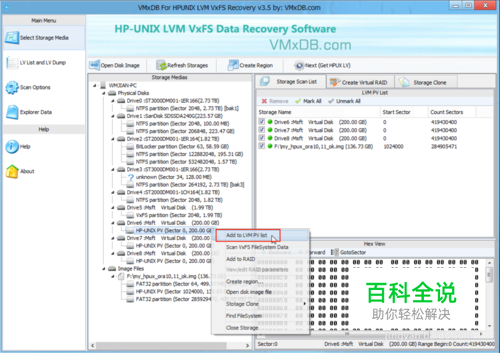 第一步: 选择要进行数据恢复的数据源 选择要进行数据恢复的数据源。 数据源可是一块或多块磁盘,也可是通过dd命令或磁盘扇区级镜像出来的一个文件。 把将要进行数据恢复的磁盘接入恢复主机,或是通过软件的 "Open Disk Image"功能打开镜像文件 . 磁盘可是一个 SATA/SAS/SCSI 接口的磁盘或是一个通过FC/iSCSI 方法映射的LUN。如无法把要恢复的磁盘接入主机,请联系我们的工程师。 恢复平台主机的操作系统我们建议使用 Windows 2008 R2 。 在Windows 2008 R2系统中新接入的磁盘或 FC/iSCSI LUN 默认是脱机模式,脱机模式下只能读操作,不能写操作,最大化保障数据安全。 磁盘接入恢复主机后,软件会自动找到磁盘。 1. 如果要恢复的卷是一个VG中的LV,需要把一个或多个磁盘,用软件自动组织成VG和LV,才能进行下一步恢复。 先把要恢复的磁盘添加到 LVM LV List ,然后点击 "Next(Get HPUX LV)" 来到第二步的自动获取LV。