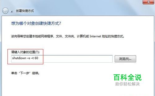 新建完成后会自动弹出界面,在输入对象的位置键入:shutdown -s -t 60,表示1分钟后执行关机命令。