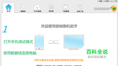 连接甜椒助手 手机设置-开发人员选项(应用程序-开发)-开启USB调试 使用数据线连接电脑(勿选择磁盘模式);如果驱动未安装,甜椒会自动为您加载驱动。