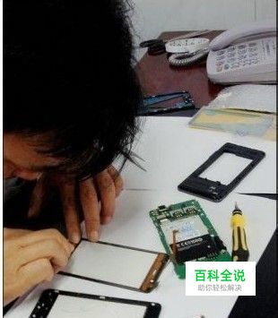 做好这些工作后,撕去触摸屏内表面的保护膜,将触摸屏由外部贴在前壳框内。贴时,注意排线和四大金刚键排线的位置。贴好后将四大金刚键排线上的小孔套在前壳定位桩上。