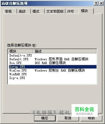 方法二:图形界面方式 首先把WinRAR的安装程序解压缩到一个文件夹,如“d:\winrar”,并把注册文件rarreg.key也复制到该文件夹。然后将配置文件中的setup.sfx复制到安装WinRAR的目标文件夹“c:\program files\winrar”;把注释文件setup.s复制到另一个文件夹,如“d:\setup”。 打开文件夹“d:\winrar”,选择所有文件并右击,选择快捷菜单中的“添加到压缩档案”。随之弹出“档案文件名字和参数”对话框。在档案文件名处输入:d:\winrarsc.exe;勾选存档选项中的“创建自释放格式档案文件”、“创建固定档案文件”、“设置用户身份校验”、“锁定档案文件”,同时把压缩方式设置为“最好”。 单击“高级”标签,选择“sfx选项”按钮,出现“高级自释放选项”对话框,单击“自释放模块”标签,选择其中的setup.sfx自释放模块。若列表中没有setup.sfx说明配置文件中的setup.sfx文件没有复制到指定的位置(如图1)。 图1 最后单击“注释”标签里的“浏览”按钮,把“从文件载入注释”定位到“d:\setup\setup.s”上。点击“确定”后退出设置窗口,这样WinRAR会对你所选定文件按照配置文件要求进行压缩设置,一个包含了注册文件的winrar3.4简体中文安装版就制作完成了。