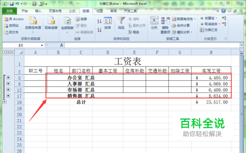 如果要显示全部的分类汇总结果,可以单击数字“3”,这里表格会显示所有的数据和分类结果。