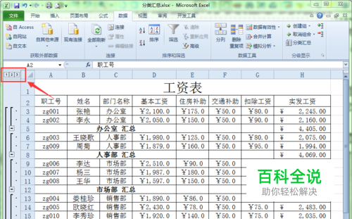 如果要显示分类汇总中各分项的汇总结果,此时可以单击数字“2”。