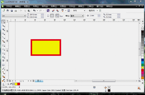 打开coreldraw画一个如下的图形, 边框加粗——选中图形——点粗线 边框颜色选红色——选中图形——右键点红色 填充黄色——选中图形——左键点黄色