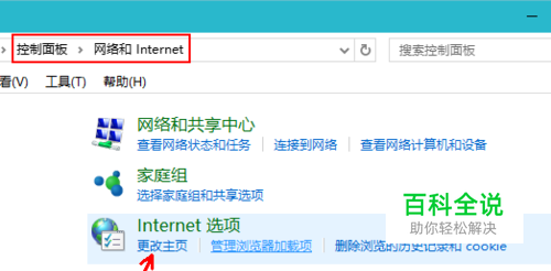打开系统的【控制面板】,选择【网络和Internet】,接着找到【更改主页】这一项,它在Internet选项下方小字位置