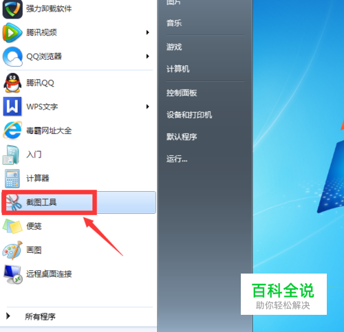 第二,在电脑桌面的左下角按【开始】,出现如下图,然后点击【截图工具】。滑动鼠标选择截图区域大小。