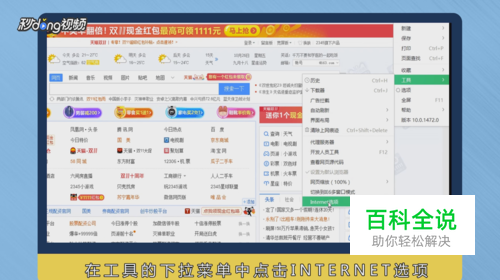 打开浏览器,依次点击右上角“菜单”按钮—“工具”—“Internet选项”。