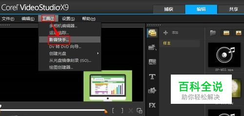 找到影音快手入口 打开会声会影X9,在软件的菜单栏中点击选择【工具】,在工具列表中选择【影音快手】。