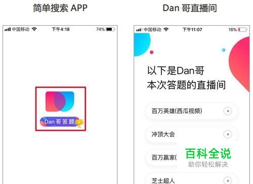 首先,提前准备好2部手机,或者带亲爱的TA一起玩 1部下载简单搜索APP,点击APP首页【Dan哥答题】进入直播间(根据需要选择不同的答题场次进入)如下图1 另1部打开西瓜视频-百万英雄(或冲顶大会、花椒-百万赢家、芝士超人)如下图2
