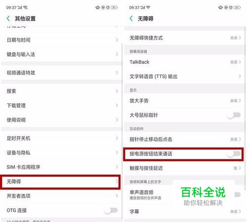 2、通过【无障碍】--找到【按电源按钮结束通话】。
