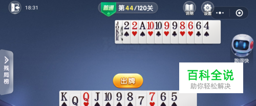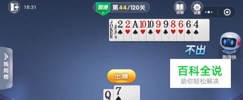 跑得快打出一张小王,接着打出一张4,然后我打出一张Q就过关了。