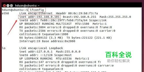 查看虚拟机中系统的ip 在ubuntu系统中打开终端,输入命令:ifconfig 注意:和windows系统下的ipconfig命令就差了一个字母。 可以看到ip地址是:192.168.0.101