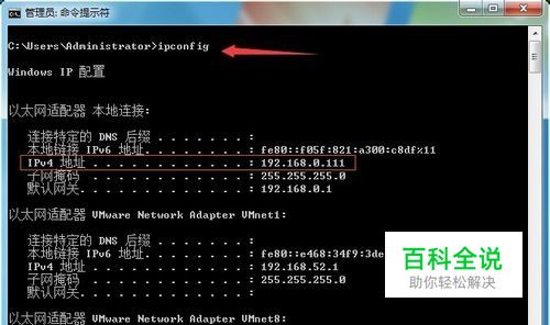查看主机ip 打开“开始”程序中的“附件”,找到“命令提示符”打开。 输入命令:ipconfig 可以看到本机的ip是192.168.0.111,网关是192.168.0.1