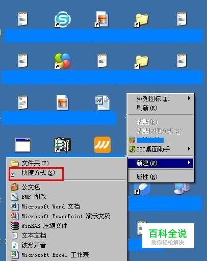 在点击了退出360桌面助手的功能按钮确定之后,我们返回到桌面,显示被360桌面助手收集归纳的软件应用图标和文件以及文件夹全部在桌面上重新显示了出来。然后我们再重新右键点击桌面空白处弹出下拉菜单,同样在下拉菜单功能列表中显示有快捷方式的新建功能.可以进入新建快捷方式的功能.