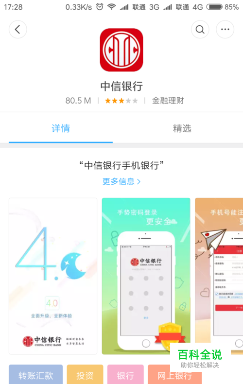 首先,先进行应用下载,在手机应用商店进行下载中信银行手机银行app,搜索后下载安装,如图所示。