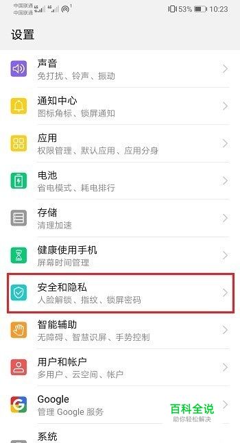 第一步打开华为mate20 pro,点击手机设置->安全和隐私,如下图所示: