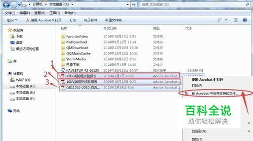 假如在我的电脑D盘中,有三个PDF文档需要合并在一起 ,我们把这三个用鼠标同时选中点右键,选中“在Acrobat中合并支持的文件”