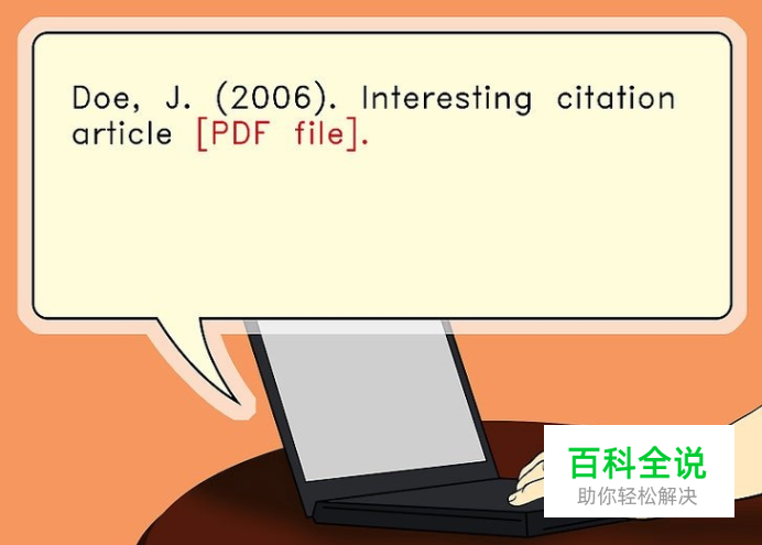 注明这篇文章是PDF文件。在文章标题后面写上PDF文件并用中括号括起来,然后点上句号。 Doe, J. (2006). Interesting citation article [PDF file].