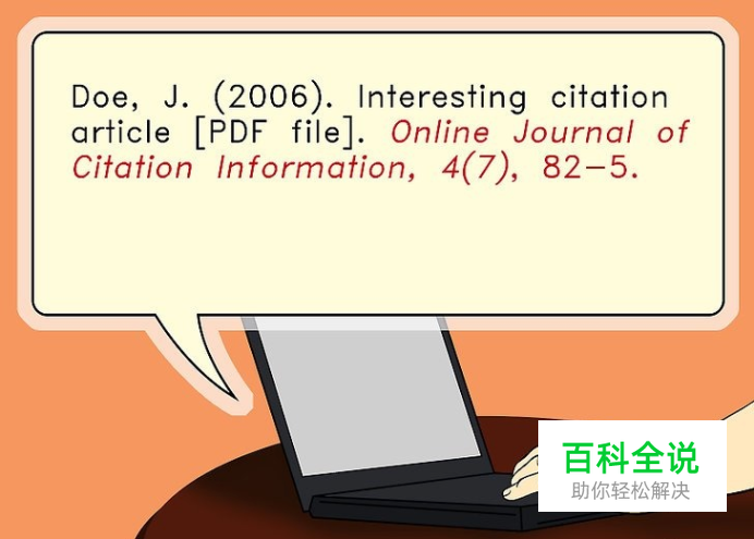 注明杂志和出版物的名称并注上卷号和页码范围。每一条信息应该用逗号分隔开,以及杂志和卷的信息标题应该用斜体。刊号应该在卷数后注明并用括号括起来。页面范围后面必须有句号 Doe, J. (2006). Interesting citation article [PDF file].Online Journal of Citation Information, 4(7), 82-5.