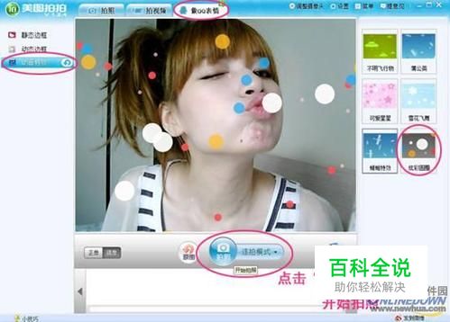 2、进入“做QQ表情”功能,选择连拍模式,再在“动画特效”里选择“炫彩圆圈”特效素材,点击“拍照”按钮就可以开始拍照啦~~
