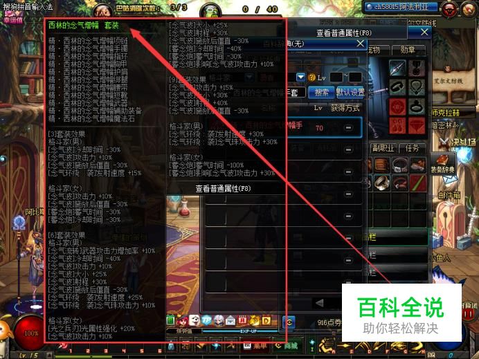 西林的念气增幅套装:该套装对“念气波”技能的强化很大,极大地提高了技能的伤害,范围,射程,缩短了CD时间等等,同时对男格斗家的“念气环绕:袭”和女格斗家的“蓄念炮”有不小的强化。